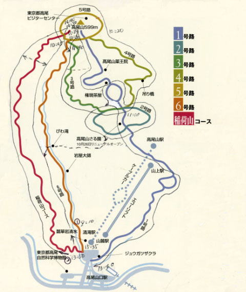 START(登山口)-->6号路(森と水コース 3.3Km 約1時間30分)-->5号路(人と自然コース 0.9Km 約30分)-->高尾山頂-->4号路(森と動物コース 1.5Km 約45分)-->3号路(高尾山の植物コース 2.4Km 約1時間)-->1号路(高尾山の自然コース 3.8Km 約1時間30分)-->2号路(高尾山の森コース 0.9Km 約30分)-->1号路(続き)-->登山口-->稲荷山コース(尾根道)-->GOAL(山頂)-->(帰路は2号路〜琵琶滝経由で6号路を下る)--->登山口